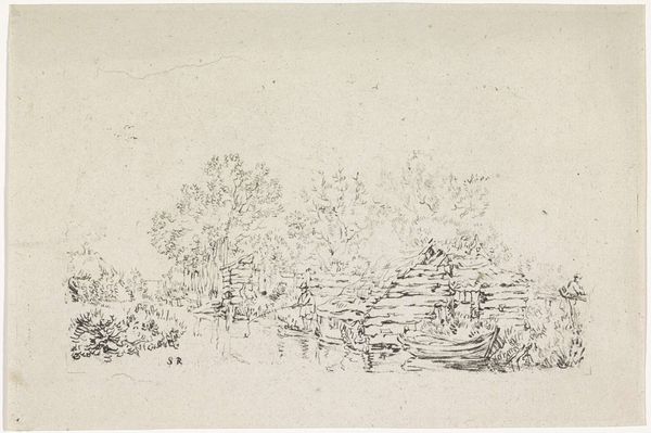 Dionys van Nijmegen created this landscape drawing with graphite, where delicate lines construct a serene yet somewhat ambiguous natural setting. The composition is anchored by a cluster of trees on the right, their forms loosely defined by layered strokes, which creates a sense of depth and density. On the left, a barely visible monument suggests a touch of classical antiquity, destabilizing the pure, untouched nature, infusing the image with a sense of historical reflection. The artist’s choice of medium, the humble graphite, enhances the sketch-like quality, emphasizing the process of observation and the immediacy of capturing a fleeting moment. The restricted palette invites us to focus on the interplay of light and shadow, which models the forms and articulates the pictorial space. Ultimately, it is the understated quality of the drawing, its quiet formalism, that encourages us to engage with the landscape on a more intimate, contemplative level.