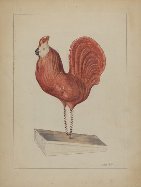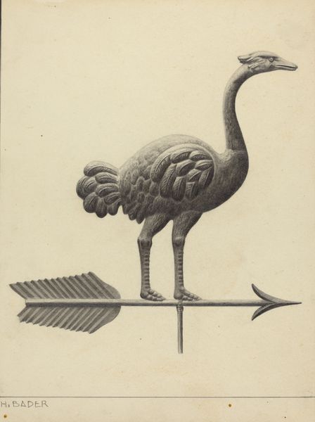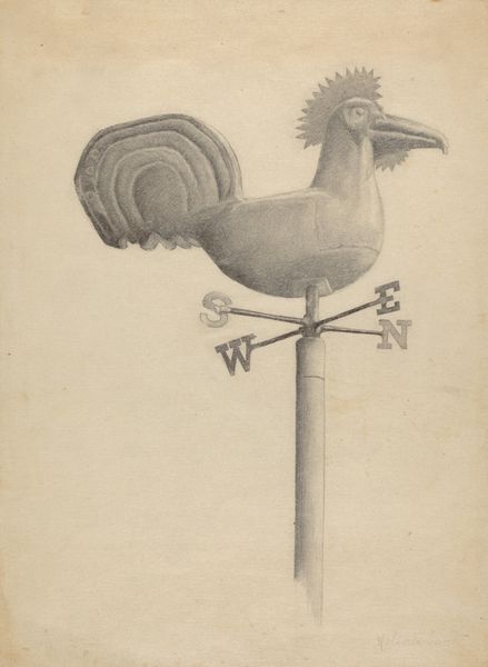 Editor: We're looking at "Weather Vane Finial," a pencil drawing from around 1937 by Milton Grubstein. There's something so grounding about a simple sketch, and the detail in this one feels quite loving. What catches your eye? Curator: Oh, "loving" is the perfect word. It makes me wonder about Grubstein, hunched over his sketchbook, painstakingly rendering each feather. It’s not just a study; it’s almost a portrait, don’t you think? I see patience and reverence in those graphite strokes. Almost as if he understood that capturing something familiar could reveal deeper truths. The humble chicken elevated to an object of art – a weather vane! Isn’t that brilliant? It shows how beauty is available to be perceived in our daily environments if we truly stop and notice. Editor: I agree. It really invites a slower looking. Do you see any particular influences? Curator: Absolutely. It’s very much a product of its time, steeped in that WPA era fascination with American craftsmanship. And there’s something inherently ‘American’ about the subject too – farm life, self-reliance… yet elevated with almost baroque flourishes in the tail. I mean, the geometry contrasts the light pencil work! And, don’t overlook his meticulous notations; the architectural measuring is an extension of his observations that serve the dual role of art and artefact! Editor: The architectural touches are intriguing. That shifts my perspective from seeing it solely as art. Curator: Right? Art shouldn't simply reflect our current thinking; it should challenge and even reshape it! Perhaps now we might appreciate its quiet sophistication a little more.