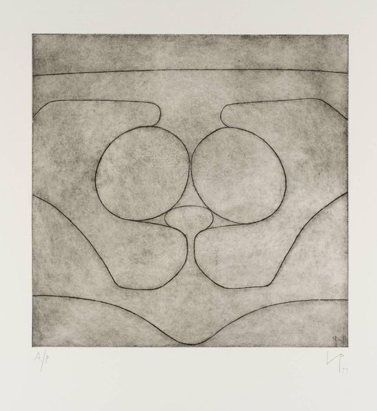 Curator: This is "The Cave of Calypso I" by Victor Pasmore. Editor: It feels very…contained, doesn’t it? The muted tones and simple lines give it a sense of quiet restraint. Curator: Pasmore was fascinated with the interplay between abstraction and classical themes. Consider the title; it immediately situates us in a very specific narrative, Homer's Odyssey, even with the abstract lines. Editor: Right, and thinking about the materials… the texture suggests a printmaking process. It's intriguing how Pasmore uses such a reproducible medium to depict something as singular as Calypso’s mythical space. Curator: It’s about challenging the perceived hierarchy, isn’t it? Elevating printmaking, a traditionally ‘lower’ art form, to explore high literary concepts. It disrupts conventional boundaries. Editor: Absolutely. The image evokes a sense of confinement, possibly reflecting Calypso's own isolation and the power dynamics in her relationship with Odysseus. Curator: A simple print can be a powerful vessel for complex narratives. Editor: Indeed. It leaves you pondering the story behind those seemingly simple lines.