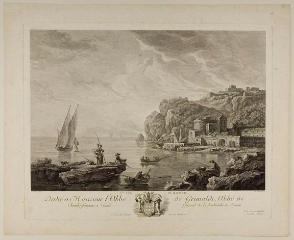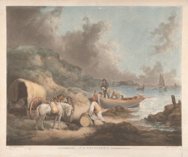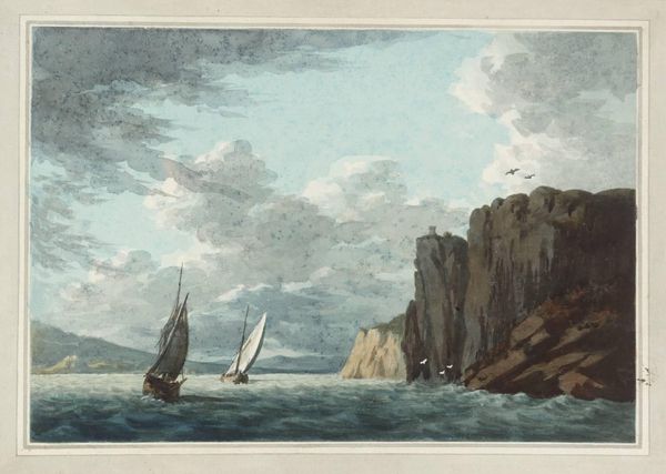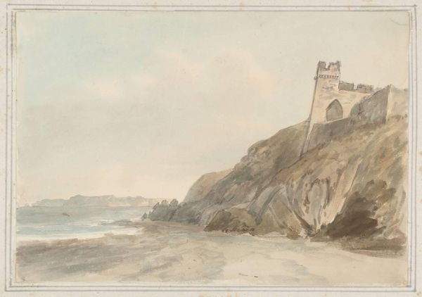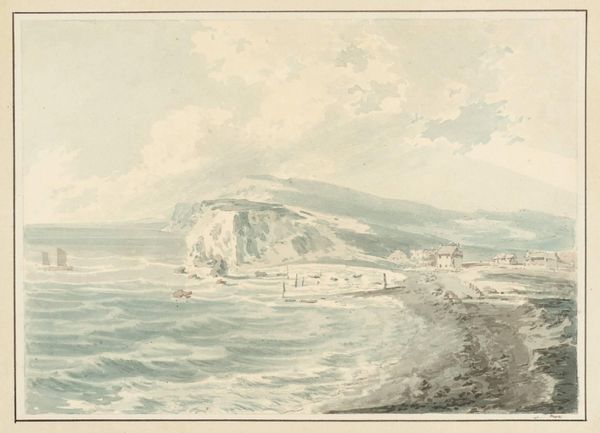 Editor: This is Nicholas Pocock's "Part of the Bay of Tenby - Northward," a watercolor landscape. I'm struck by the subdued palette and the depiction of labor, a small boat and distant figures. What can we learn about the social context surrounding this artwork? Curator: Notice how Pocock, a marine artist, emphasizes the labor involved in navigating and inhabiting this coastal space. The materials – watercolor on paper – democratize landscape painting, making it accessible for both amateur and professional artists. Consider the consumption of such imagery; how did scenes like this shape perceptions of the British coastline and its resources? Editor: That's fascinating! Thinking about watercolors as a more accessible medium definitely shifts my perspective. Curator: Indeed. It reveals how artistic production intersects with broader economic and social trends. Editor: I'll definitely be looking at materials with fresh eyes going forward. Thanks!
