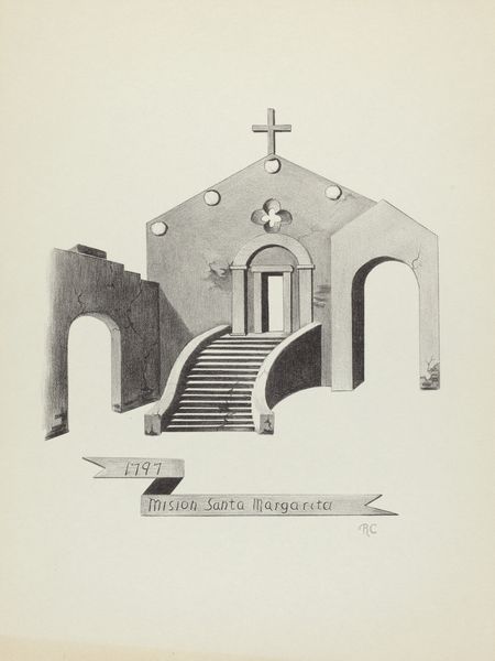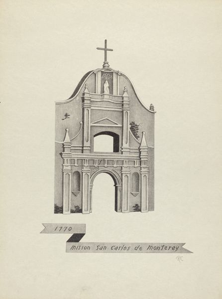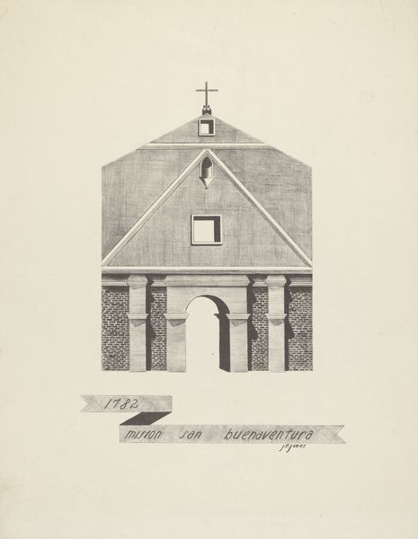 Curator: Welcome. Here we have James Jones's drawing, "Mision Santa Clara", completed sometime between 1935 and 1942. Jones renders the facade of the Mission with graphite on paper. Editor: The first impression is of austere symmetry, almost cold in its precision. The grey-scale palette enhances the formal quality, presenting this architecture as pure design. Curator: Observe how Jones uses line and shading to create a sense of depth, despite the flat medium. The balanced composition directs the eye upward, toward the triangular pediment topped by the all-seeing eye symbol. The repetitive use of rectangles, arches and small urns gives an inherent visual rhythm to the facade. Editor: I wonder how Jones, working decades later, grappled with the mission’s legacy? Missions represent not just religious structures, but sites of colonial imposition, violence, and cultural disruption to indigenous communities. The artist's dedication to exact detail, seemingly avoiding personal intervention or commentary, could be seen as sidestepping any kind of critical reevaluation. Curator: Or perhaps it speaks to the transcendental nature of the architectural form itself, lifted from the messy currents of politics and situated within a discourse of geometry, structure and permanence? Jones reduces a complex social reality to its abstract components. Editor: But can we really separate form from content, especially when the content is about structures built to facilitate power dynamics and historical oppression? Maybe Jones' hyperrealism serves as a reminder of these structures that continue to dominate the California landscape and societal imagination. Curator: It could be seen as both a formal appreciation of design, and as you mention, a documentation of power and presence. Editor: In the end, this work highlights how something can look so carefully rendered and appear simple at first glance, while simultaneously speaking to larger narratives about design, colonization and social implications.