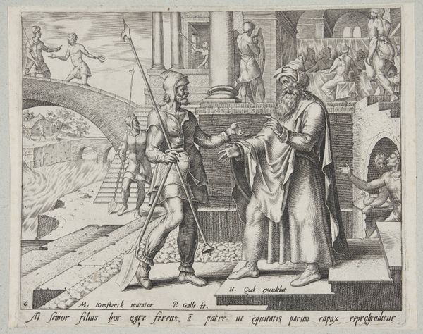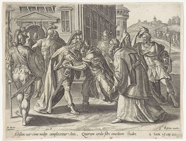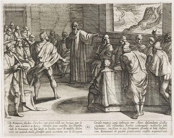 Curator: This print, titled "Plate 23: Conference on What Steps to Take Upon the Romans' New Troops Approaching Across the Alps, from The War of the Romans Against the Batavians," was created by Antonio Tempesta around 1611 or 1612. It's currently housed at the Metropolitan Museum of Art. Editor: Immediately striking. The sheer number of figures tightly packed together creates a sense of urgency and perhaps even panic. The contrast between the active figure in the foreground and the seated council behind him is quite compelling. Curator: Tempesta, working in the Baroque style, used etching and engraving to illustrate this historical event. It depicts a conference deliberating on how to respond to the approaching Roman troops, as they cross the Alps. The landscape with the tiny army marching along seems intentionally diminutive in comparison to the intensity of the conference itself. Editor: It makes you think about power dynamics, doesn’t it? This image represents that pivotal moment of discussion among decision-makers of different positionalities prior to conflict, a time charged with potential and fear. Who gets to speak, whose voice carries weight, what pre-existing allegiances will color their decision? Curator: Exactly! The scene is part of a larger series documenting the Roman-Batavian War, reflecting the political climate of the time and ideas of resistance against dominant powers. Consider how such imagery might have resonated in the context of 17th century European conflicts. It definitely plays into ideas of national identity and resisting foreign occupation. Editor: Absolutely. The strategic use of visual language, almost theatrical, invites us to interrogate the portrayal of Roman dominance and consider those who may not be readily apparent within such portrayals of authority, and what possibilities lay within negotiation, contestation, and peace. The choice to portray this moment—rather than any moment on the battlefield—is incredibly deliberate. It reminds us to reflect on the voices in such historical circumstances who called for another resolution. Curator: Tempesta gives us a moment steeped in its own historical milieu, allowing us to examine historical dynamics, and how visual imagery served particular socio-political narratives. Editor: And from that space we recognize that visual depictions from history often teach us so much about contemporary urgencies. It urges viewers to reflect upon what alternatives and peace resolutions they find within conflicts in their present.