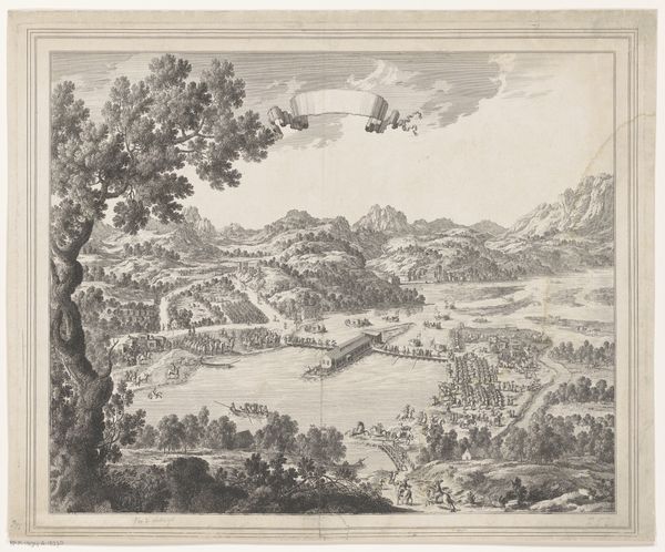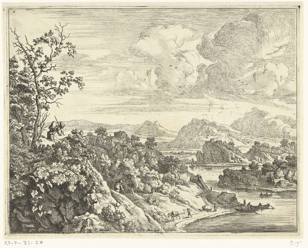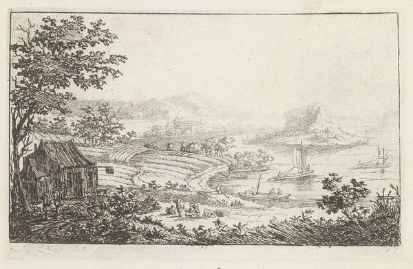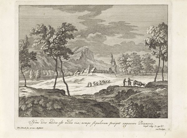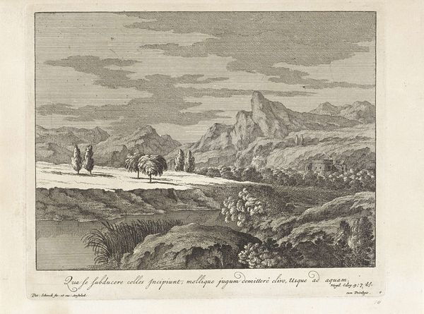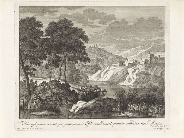 Pieter Schenk created this detailed etching of a landscape with a shepherd and animals, now held at the Rijksmuseum. The composition, divided horizontally, presents a foreground of detailed vegetation leading to a middle ground where the figures and animals are placed, against a backdrop of distant mountains and architectural elements. Schenk employs a structured approach to organizing space, using the reflective water as a dividing plane that enhances depth. The intricate line work defines the texture of the foliage, the contours of the landscape, and the atmospheric perspective that softens the distant peaks. The work invites contemplation on the relationship between humanity and nature, mediated through Schenk's formal control of line and space. In this way, the etching functions as a site for exploring the construction of pastoral ideals through the structured language of visual art.