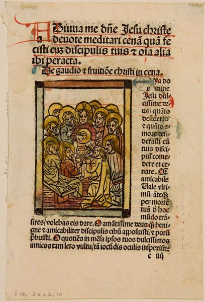 Curator: This is Illustration XXVI, an anonymous work held here at the Harvard Art Museums. Editor: It's immediately striking how tactile and handmade it feels. The ink bleeds and pools slightly, giving it a very earthy presence. Curator: Indeed. The materials themselves speak to the labor involved in its creation, the painstaking process of hand-lettering and illustrating on vellum. Editor: And the imagery! The descending Christ figure, the halo, the banner he carries. The liberation of souls from some kind of underworld is powerfully conveyed through these visual cues. It’s such a potent symbolic moment. Curator: Consider, too, the context. These illuminated manuscripts were luxury items, often commissioned by wealthy patrons or religious institutions. The physicality of the book, its weight and texture, was part of the experience. Editor: Right. It's a material object meant to inspire contemplation. The artist utilizes visual symbols to help its readers contemplate liberation. It really gives you an intimate look into past cultures and their belief systems. Curator: Looking closer at its materiality has certainly deepened my understanding. Editor: And for me, unraveling the symbolic language amplifies its emotional core.