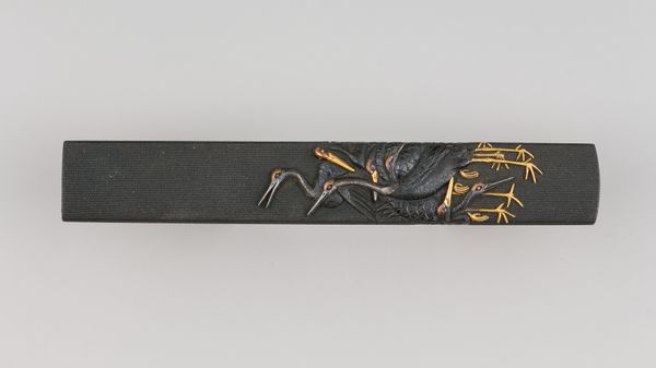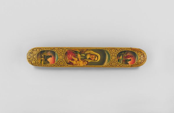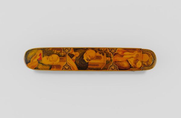 Curator: I’m immediately struck by the almost dreamlike quality of this scene, like something glimpsed through amber. Editor: Indeed. What we're looking at is a pen box adorned with an image of Muhammad Shah Qajar and Nur `Ali Shah, crafted by Abu’l-Hasan Isfahani. It's currently held at the Harvard Art Museums. The box has these petite dimensions; roughly 5 by 6 by 28 centimeters. Curator: A pen box, so an object of daily use elevated into an artistic statement. Do you think the reclining figure signifies repose or perhaps a more symbolic relinquishing of earthly concerns? Editor: I see the depiction of the Shah and the Sufi master less as repose and more as a subtle assertion of power merged with spiritual authority. Remember, pen boxes were often gifts, laden with intent. Curator: That gives me something to think about regarding how the choice of imagery shapes its cultural impact. Editor: And I am now thinking about how the intimate scale invites a closer look, a quiet contemplation.