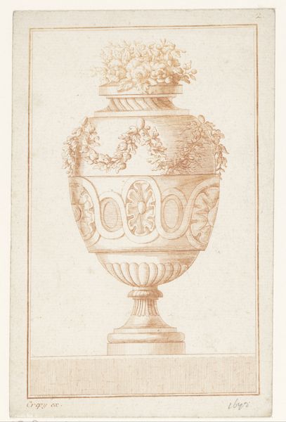 This anonymous drawing presents a classical vase, its form meticulously rendered with delicate lines. The composition is symmetrical, lending a sense of balance and harmony to the design. The vase itself is adorned with classical motifs, including leafy garlands and a pineapple finial, each element carefully delineated. The drawing operates within a visual language that speaks to the ideals of neoclassicism, emphasizing order, clarity, and rationality. The vase, a common symbol in classical art, represents containment and form. Here, its shape is amplified through precise linework, creating a sense of depth. The garland adds a layer of ornamentation, a touch of organicism that softens the otherwise rigid geometry. Note how the artist has used subtle shading to define the contours of the vase, giving it a three-dimensional presence on the page. This technique enhances our perception of its physical form, grounding the design in a realm of tangible, rather than purely conceptual, space. The vase embodies not just aesthetic beauty but also intellectual order.