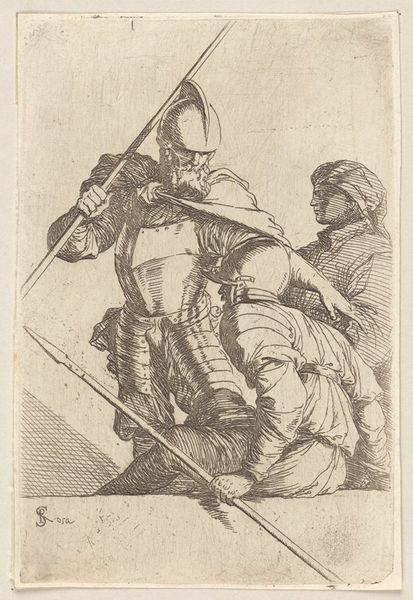 Stefano della Bella made this small print, Two Heads of Old Soldiers, with ink on paper sometime in the mid-17th century. The technique used to create it, etching, allowed the artist to generate multiples. Etching involves coating a metal plate with a waxy, acid-resistant substance. The artist then draws through this coating, exposing the metal underneath. When dipped in acid, the exposed lines are eaten away, creating grooves in the plate. Ink is then applied to the plate, filling these grooves, and the surface is wiped clean. Finally, the image is transferred to paper under high pressure. The linear quality of the work is a direct consequence of this process. Consider how the etched lines define the contours of the soldiers' faces and helmets, creating a sense of depth and texture. In a society increasingly governed by mass production, etching played an important role, allowing artists to circulate their ideas widely. This print embodies the tensions between the hand-made and the mechanically reproduced.