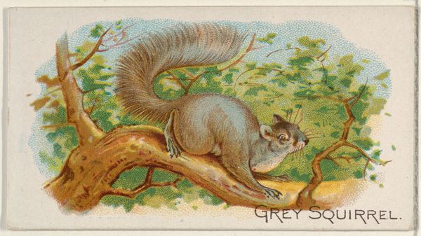 Editor: So, this is “Beaver, from the Wild Animals of the World series,” made in 1888 by Allen & Ginter. It's a print, created with coloured pencils. It strikes me as kind of quaint, almost like something out of a children’s book. How do you interpret this work? Curator: What interests me most is the means of its production and insertion into a wider network of consumption. This isn’t some fine art print meant for a gallery. It's a mass-produced insert, included in packages of cigarettes. It's academic art at the service of the tobacco industry. Editor: That's a very different way to think about it. I was just seeing a cute beaver! Curator: Exactly! Think about the materials involved, the paper, the ink. Who produced them? What were the labor conditions like? These cards are small objects, but they tell us about late 19th-century industrial capitalism, how companies sought new ways to market their products. Editor: So, the subject matter, the beaver itself, is almost secondary to its function as part of a larger system? Curator: Precisely. Consider the idea of "Wild Animals of the World." It suggests an understanding of and relationship with the natural world predicated upon collecting, owning, categorizing. These images were meant to be traded, collected, possessed, thus flattening any understanding of an animal and reducing it to a mere commercial product. Editor: I hadn't thought of it that way. It is quite unsettling to consider it as a tool of commercial control. I definitely have a broader perspective now. Curator: Seeing it within the material conditions of its creation opens up all sorts of avenues for questioning and analysis, wouldn't you agree? It transcends simple aesthetics.