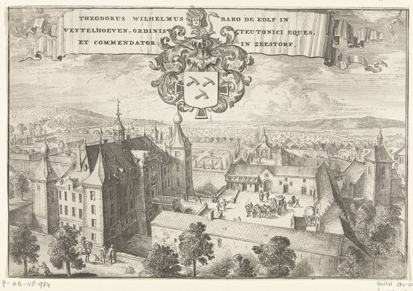 Editor: So this print, “Gezicht op Bolsward” from 1679 by Gaspar Bouttats… It’s such a detailed cityscape. I'm immediately drawn to the almost diagrammatic quality of the presentation. How do you interpret this work, especially considering its historical context? Curator: That "diagrammatic quality" speaks volumes! We’re seeing Bolsward represented during the Dutch Golden Age. This wasn't just a pretty picture; it was a statement of civic pride and probably commerce. Note how the fortified walls and coat of arms are prominently displayed. This speaks to identity, doesn't it? Who do you think this image was intended to reach and what message was to be understood by it? Editor: I guess it’s for people who want to come to this place...like advertisement. You are right to call attention to the coat of arms above the city; it suggests civic power and independence. The level of detail is so intricate! What would motivate an artist to create this image? Curator: The Dutch Golden Age witnessed an explosion of cartography and cityscape art. Think about the Netherlands' newfound economic power, and the rise of a merchant class eager to display their success. These cityscapes acted as symbols of control and order within a burgeoning capitalist system. The artist is essentially saying: look at our city, our wealth, our ability to civilize and organize space! Consider also what might be *omitted* from an image like this, what lived experiences of women, working class or enslaved people do *not* get centered here. Editor: I hadn't considered it in quite that way. So, this seemingly straightforward landscape is actually communicating complex ideas about power, commerce, and even social class. Curator: Precisely. It's a potent visual document reflecting the social and political structures of its time. The walls themselves visually remind viewers what’s on the outside versus what values, activities, and wealth the walls encircle. Editor: That makes me see the engraving with a new sense of perspective! Thank you. Curator: My pleasure! It’s all about excavating the layers of meaning embedded within the art.