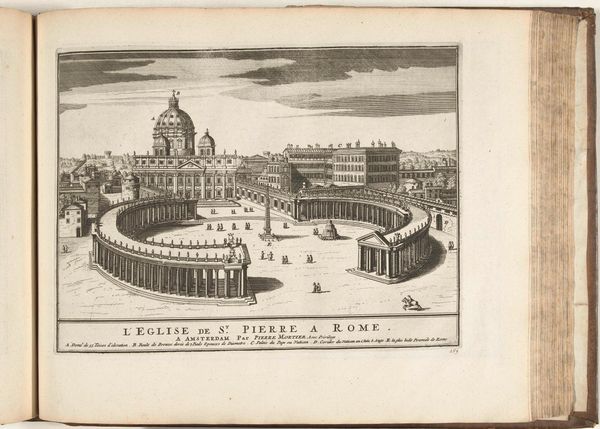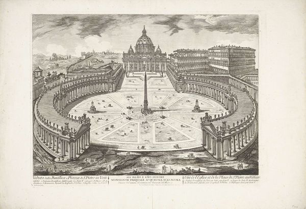 Curator: Take a look at this print, created between 1665 and 1669 by Giovanni Battista Falda. It's entitled "Veduta di Tutta la Basilica Vaticana," a view of the entire Vatican Basilica, published as part of a series of prints documenting modern Roman architecture. Editor: My first thought is how commanding this space is! There’s an almost theatrical drama in the perspective and the grand sweep of the colonnade, creating such a sense of awe and power. Curator: Absolutely. The baroque style really emphasizes this. What you're seeing is the result of centuries of architectural and political ambition focused on the Vatican. Falda documented how these spaces functioned within the context of papal authority. It showcased Rome as a renewed center of power. Editor: Visually, that dome—the cupola— really grabs the eye. It's not just a part of the architecture, it almost feels like a character watching over the entire scene, representing the Church itself. And all those figures populating the square? Curator: Well, these weren't photographs, of course, but architectural prints served as ways to communicate the success of these large building programs across Europe, displaying Rome as this must-see, central, artistic location. Consider how Bernini's colonnade physically embraces those entering. The church becomes this symbol of welcome but also unquestionable authority. Editor: You are so right about the feeling of welcome that turns to a kind of expectation to feel reverence! I’m drawn to how the architecture mimics gestures. That open colonnade reminds me of outstretched arms, drawing the viewer inward and directing them to the basilica’s imposing facade. It suggests not just physical movement, but perhaps spiritual or ideological alignment as well. Curator: Exactly! These weren't just views, they shaped public perceptions of religious and political power in Rome. These images carried real weight. Editor: It is amazing to see how places can turn into carriers of cultural memory. Falda gives us a beautiful glimpse into the Vatican Basilica's ability to communicate and shape faith and social identity. Curator: Seeing the image, we can think about how buildings function beyond their aesthetic attributes and influence social patterns, and how political and spiritual narratives live on through stone, and through art.