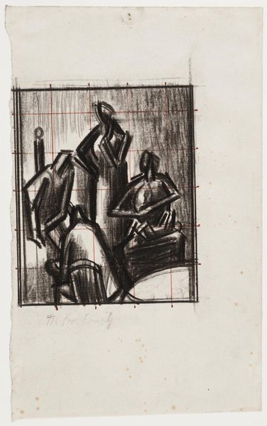 Editor: So, this is Barnett Freedman’s "Untitled" print, from the Tate collection, made with unconfirmed materials. It feels very insular, a closed community almost. What social dynamics do you see represented here? Curator: It’s interesting you use the word insular. Look at the figures—consider the societal roles present. We see what appears to be a somber gathering, perhaps influenced by post-war realities and class dynamics in Britain. What does the framing around the image evoke for you? Editor: It does add to that sense of being enclosed. I see a division between the figures and the decorative border. It's almost as if they're trapped within a specific historical context. Curator: Precisely. Freedman’s work often highlighted the working class. Think about the potential power structures at play. Does the artist critique or simply observe? Editor: I hadn't considered that before. It really makes you think about who has a voice and who doesn't. Thanks!