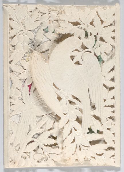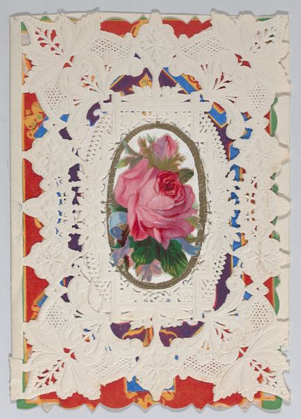 Curator: Take a look at this intriguing piece. It’s called "Valentine," created anonymously sometime between 1845 and 1875. What strikes you first? Editor: It’s overwhelmingly delicate. All that lace-like detail, the pastel watercolors peeking through…it feels incredibly fragile, a whisper of a sentiment. Like something that could easily fall apart. Curator: That fragility is interesting. These Valentine cards became quite popular in the Victorian era as a tangible expression of sentiment in a rapidly industrializing society. The intricate detail, achieved through a combination of printing and hand-applied watercolor, represented a level of care and investment that mass-produced goods couldn't match. Editor: Right, it’s like a coded language of love. We see the cherubs up top, those familiar symbols of affection, but arranged within a larger scheme dominated by floral motifs. Flowers themselves have rich iconographic meanings - are we supposed to analyze the significance of different floral patterns here, deciphering a suitor’s intentions? Curator: Possibly. While individual blooms had specific connotations, the overwhelming floral ornamentation itself speaks to a Victorian sensibility prioritizing ornate displays. Consider how Valentine’s Day shifted during this time, becoming less of a rowdy festival and more of a restrained, sentimental occasion celebrated through commercially produced goods. Editor: So, the mass production undercuts the notion of genuine, hand-crafted sentiment, even when it appears visually opulent. Is this ornate detailing a way to distract from or perhaps compensate for mass production and commercial culture? Curator: Exactly! The card becomes a site of negotiation. By giving such an elaborate creation, the sender attempts to show deep feeling through a socially acceptable and aesthetically pleasing way of the era. Editor: It reminds us that symbols themselves evolve and are always interpreted through a cultural lens. Today we look at the excessive details and may perceive manufactured feeling; someone in 1860 might see deep care and investment. Curator: Yes, context is key. And ultimately, the 'Valentine' is still a remarkable historical record about visual culture and shifting notions of intimacy. Editor: A pocket-sized cultural artifact imbued with both heartfelt intention and revealing contradictions. Thank you for this interesting conversation!
