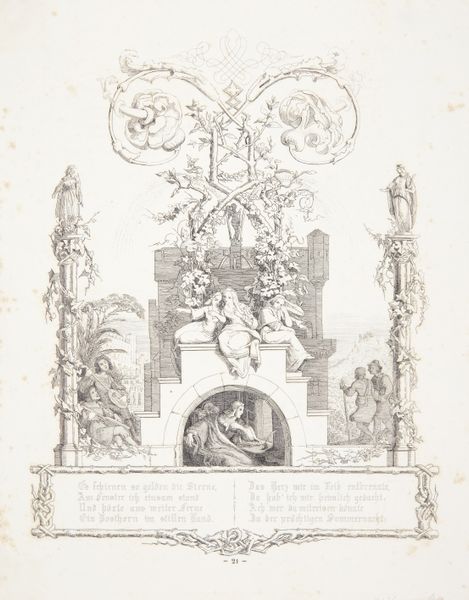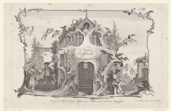 Johann Esaias Nilson made this print, "Poorten met een kok en een vrouw," using etching. This intaglio process involves drawing into a prepared ground on a metal plate with a sharp needle, then immersing the plate in acid. The acid bites into the metal where the ground has been removed, creating recessed lines that hold ink. Consider how this process impacts the appearance of the print. The linear quality, achieved by the artist's hand directly engaging with the metal, gives the image its crisp, delicate character. Nilson's skill with the etching needle results in fine details and shading, lending depth to the scene. Prints like this were widely produced in the 18th century, indicative of a growing consumer culture. They democratized art, making images accessible to a broader audience than unique paintings. The labor involved in creating such prints reflects the industrious spirit of the time, where craftsmanship and skill were valued. Appreciating the process and material allows us to see beyond the image, to understand the social and economic context in which it was created.