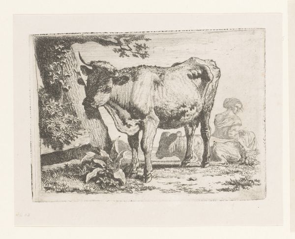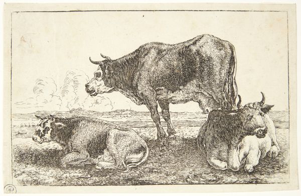 Curator: Here we have "Cows and a Calf with Bell around the Neck", an etching created sometime between 1762 and 1829 by Jean Louis Demarne. Editor: My first thought is how bucolic it is, like a glimpse into an older, simpler way of life. The lines create a soft, almost hazy feel, very different from the sharp realism we often see today. Curator: Absolutely, and that soft focus has a historical root. The etching medium, with its reliance on line and texture, allows for a particular type of representation. Demarne uses it to depict cows, a calf with a bell, and a rural landscape scene that speaks volumes about the era's agrarian values. Think about the symbolism: cattle representing prosperity and nourishment. The bell around the calf's neck? A symbol of domestication and control. Editor: It also brings up questions of labor, doesn't it? We're invited to appreciate the 'peaceful' scene, but who is benefiting from this labor, and at what cost? Who owns these cows? We see figures in the background. Are they laborers or landowners? Curator: Those background figures introduce us to questions of the era's social structures, with their subtle cues to inherited tradition and implicit economic stratifications. Demarne uses line not just to depict forms, but also to convey these loaded pastoral signifiers. Note also how this representation differs drastically from heroic representations of labour one may expect from a state commission. The very scale suggests a focus on genre instead. Editor: The choice of subject really underscores that genre focus. It's an intimate look, almost a celebration of everyday life – even if, for whom? And the 'realism' feels carefully constructed to reinforce that specific idealized narrative. Curator: Indeed. Even within its genre, the artwork hints at greater narratives surrounding the period, revealing how symbols operate within a system of cultural and political exchange. Editor: Ultimately, this is where art historical interpretation meets contemporary critical inquiry—a process that ideally invites continued dialogues. Curator: Precisely so.