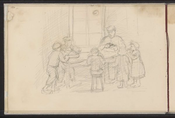 S. van Os made this drawing of a boy and mother leaving a shop with ink on paper. The ink creates a sense of immediacy, like a quick sketch done on the spot, capturing a fleeting moment of everyday life, but in a way that is both tender and observant. The lines are loose and expressive, varying in thickness and density, creating depth and shadow. Look how the artist uses hatching and cross-hatching to create texture in the clothing. There's a beautiful passage just below the figures near the shop door, where the ink seems to pool and bleed, giving a sense of the wet ground, or maybe even a touch of melancholy. This reminds me of the drawings of Käthe Kollwitz, in the way it captures the quiet drama of ordinary people and the emotional weight of their experiences. Ultimately, it's a deceptively simple work that stays with you, inviting you to reflect on the beauty and complexity of human connection.