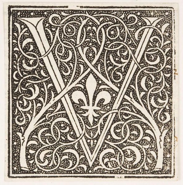 Editor: This is "Letter I," by an anonymous artist. The dense, swirling patterns in black and white create a really striking visual. What stands out to you in this piece? Curator: The interplay between positive and negative space is paramount. Notice how the stark white "I" is not merely a form but a void carved from the intricate black foliage. The eye oscillates between figure and ground, creating a dynamic tension. Editor: So, the letter isn't just the subject, it's part of a larger visual equation? Curator: Precisely. The artist uses the letterform as a structural anchor within a decorative field. The density of the pattern emphasizes the letter's simple geometry. This interplay is the essence of the work. Editor: That's a helpful observation. I'll look at letterforms differently now.