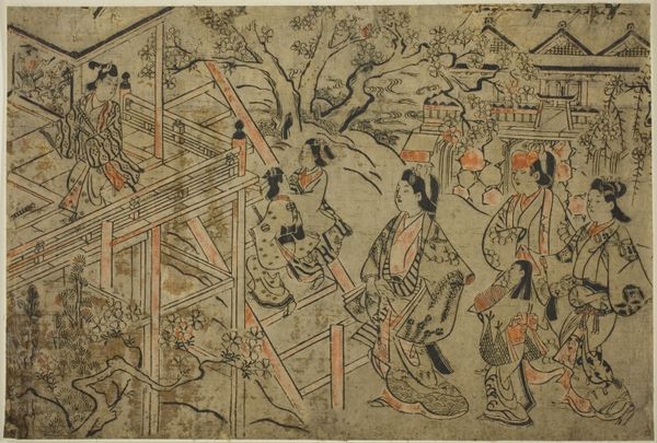 Editor: So, this woodblock print, "Enjoying the Evening Cool near Ryogoku Bridge," by Okumura Masanobu, dates from around 1740. It’s teeming with figures, creating a feeling of warmth and activity, but also a slightly claustrophobic effect with its built environment framing. How do you interpret the cultural significance of a scene like this? Curator: Consider how visual representations of leisure have echoed through time. Masanobu presents us with a constructed space from which to view leisure. The bridge, the figures within the room—each carries symbolic weight. Note the women indoors are confined to that space, while the activity takes place out on the river. Does this then say something about freedom and who is entitled to it at the time? Editor: That’s a really interesting point. The architectural space definitely feels like it’s delineating different roles. It's like a stage. Curator: Precisely. The stage itself, with its exaggerated perspective, also functions as a kind of *window* onto societal values. Think about how these "perspective pictures" -- *uki-e* -- gained popularity. Was it simply for novelty, or did they offer a new way of seeing, reflecting, and perhaps even questioning the social order? Editor: I hadn’t thought about the act of seeing itself being part of the message! It’s not just *what* they are doing, but *how* they are viewing. Curator: The act of viewership is inherently related to control and what one finds appealing or distasteful, revealing the psychological underpinning of any scene like this one, inviting viewers to explore their own place within the narrative. Editor: This really shifted my perspective on what the painting meant, and how a genre scene isn’t as simple as it first appears. I need to dive into the concept of constructed realities and power dynamics a bit more. Curator: Absolutely! The symbols embedded within this image invite ongoing dialogue with our present, connecting past to present and revealing new emotional layers.