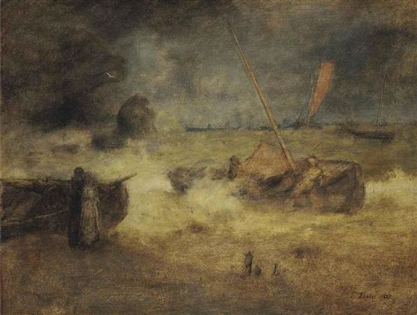 Editor: So, here we have Vincent van Gogh’s "Dunes with Figures" from 1882. Painted with oils, it gives a muted, almost melancholic feeling. The figures seem lost in the vast landscape. What do you see in this piece, considering the time it was made? Curator: This work offers a window into Van Gogh’s early exploration of the social landscape and his emerging artistic concerns. Notice how he positions the figures within the environment. It speaks volumes about class, labor, and the artist’s own place within that societal framework. What do you think the vastness of the dunes represents in relation to these figures? Editor: Perhaps their struggle, or maybe their isolation. The figures are so small compared to the dunes, they appear almost insignificant. Curator: Precisely. Consider also that Van Gogh, at this time, was deeply interested in representing the lives of working-class people. This wasn't just aesthetic; it was a deliberate social and political statement. The muted tones, the heavy brushstrokes – they contribute to a sense of the weight and struggle of daily existence. How does this relate to the rise of Realism at that time? Editor: Well, Realism was all about depicting life as it truly was, without idealizing it. Van Gogh seems to be doing that here, but with a rawness that feels even more personal. It feels heavier. Curator: Exactly. It’s realism filtered through Van Gogh’s own empathetic lens. Understanding that historical context really shapes how we perceive not just the landscape, but the statement Van Gogh was making about the people within it. Editor: This piece really speaks to how art can be so intertwined with social commentary. I hadn’t thought about it in that way initially. Curator: It’s a reminder that art rarely exists in a vacuum; it’s always in dialogue with its time.