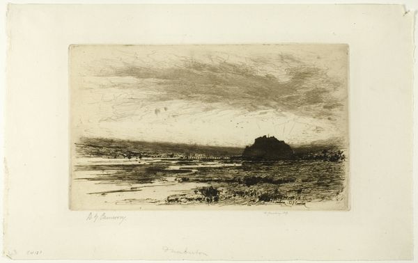Curator: What a wonderfully somber landscape. Editor: It is striking. You're looking at David Young Cameron's "Dinnet Moor," an etching from 1912, here at the Art Institute of Chicago. It’s a moody composition in blacks and grays. The heaviness in the sky really pulls you in, doesn’t it? Curator: It does, though the most remarkable thing is the tangible impression of the artist’s hand through the etched lines on paper. This level of intimacy would depend on the tools available. What sort of etching needles, acids, and paper would have afforded Cameron this unique expressivity? Editor: The etching medium was incredibly popular in the late 19th and early 20th centuries, really opening printmaking to a wider group of artists and audiences. Consider its role within the broader context of the art market at the time. Curator: Yes, these landscapes provided artistic consumption for a middle-class clientele, feeding their idealized visions of the Scottish countryside. Editor: Absolutely, but consider the image itself: there’s a quiet, brooding beauty in the way Cameron portrays the terrain. It speaks to something more than just simple consumption. This moor, etched in 1912, reflects anxieties towards encroaching industrial landscapes of the modern era and idealized notions of rural living in Great Britain. Curator: Do you see any visible texture? I imagine the type of paper used impacts the quality of that black ink, affecting its texture. What happens when the paper’s acidity compromises its long-term preservation? Editor: Of course. Every element—paper, ink, the biting process itself—contributes to our understanding. I also see it through the lens of institutional representation, of how Cameron’s art entered collections like this and how it's circulated and interpreted. Curator: Those dark lines really capture the wild beauty. An intriguing and complicated history brought to life through an engagement of labor. Editor: Right, it invites further contemplation about what we value and why we’re drawn to these landscapes even today.