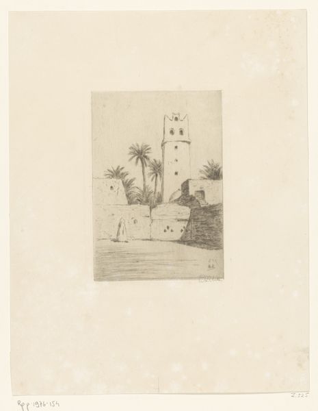 Editor: This is "Sprong van laatste Mammeluk" by Frederik Hendrik Weissenbruch, created sometime between 1867 and 1874. It's a print, an engraving in metal, now held at the Rijksmuseum. There’s something so dramatic about the figure leaping from the wall, especially given the intense shadow. What is your interpretation of this work? Curator: This piece, I believe, encapsulates the 19th-century fascination with narratives of power, resistance, and ultimately, the decline of empires. The Mamluks, though defeated in Egypt earlier in the century, represented a romanticized vision of resistance against European colonial ambitions. Editor: So, the image serves almost as a political allegory then? Curator: Precisely! The artist positions the viewer to admire the Mamluk's daring, even while knowing his cause is lost. Consider the role of the Rijksmuseum itself – a national institution solidifying a Dutch identity partly in relation to its own colonial past and its perception of other empires' struggles. Do you see how the setting - this imposing, vaguely 'oriental' architecture - plays into that? Editor: I see your point. The architectural details do seem to exoticize the scene. But is there perhaps an element of celebrating individual heroism beyond the political message? Curator: A valid point. The dramatic action, the skilled rendering of horse and rider, certainly speak to an appreciation of individual courage. But even that appreciation, I argue, is filtered through a Western lens, aestheticizing a moment of defeat within a larger narrative of imperial dominance. The focus isn't so much on historical accuracy, but on a feeling, a drama. Editor: That's insightful. I hadn't considered how the museum context and the artistic choices intersect to create such a layered message. Thanks for sharing that. Curator: And thank you for your curiosity! It is always rewarding to rethink about artworks through a fresh and sharp perspective.