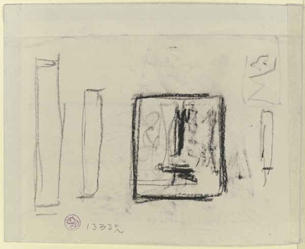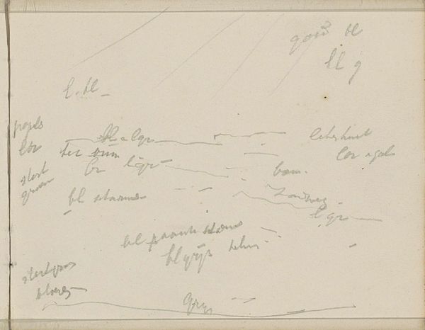 Leo Gestel made this drawing, Landschap met huis, with a graphite pencil on paper. This piece feels like a fleeting thought, a landscape barely registered before being swept away. The graphite is laid down in quick, almost frantic marks, capturing the essence of a house nestled within a landscape. It’s all about the process, the act of seeing and immediately translating that vision onto paper. Look at the vertical strokes suggesting the house’s walls. They’re not precise, but they convey a sense of structure against the more freely drawn lines of the surrounding landscape. Some scribbled notes beside the house add another layer. Gestel reminds me of Cezanne, capturing a scene not as it is, but how it felt to be there, a constant flux of impressions rather than a static image. It's less about what we see and more about how we see. It's this ambiguity that keeps me coming back.
