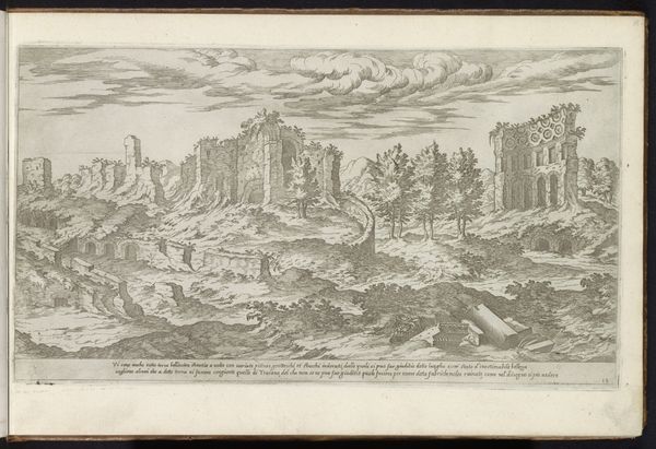 Étienne Dupérac made this print of the Palatine Hill in Rome using etching techniques, sometime before his death in 1601. The image captures a landscape of classical ruins overtaken by nature, a popular genre in 16th-century Europe that reflects a fascination with antiquity and its decay. Prints like this played a vital role in shaping cultural perceptions of Rome. They catered to a growing market of collectors and tourists eager to acquire visual records of famous sites. This print flattens the hill, accentuating the picturesque qualities of the ruins while downplaying any evidence of modern life. The image, thus, presents a carefully constructed view that highlights the grandeur of the past. For a deeper understanding, explore the patronage networks and printmaking workshops of the time, and consider how these images contributed to the construction of a shared European cultural identity rooted in classical heritage.