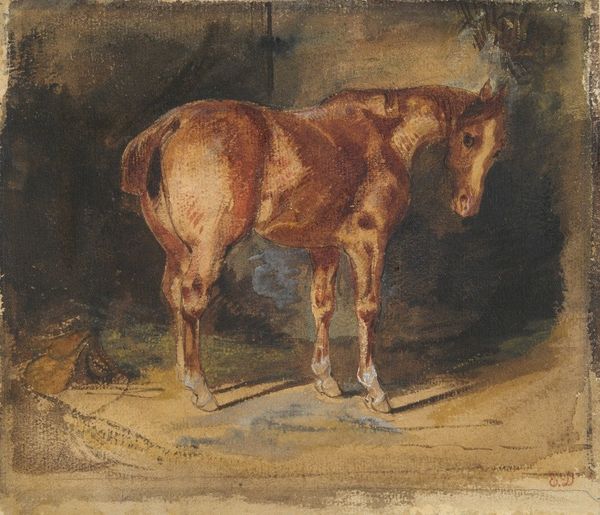 Editor: This is "Two Bulls Wearing a Yoke," painted by Henri de Toulouse-Lautrec around 1881. It's an oil painting, and I find it unexpectedly pastoral for Lautrec; almost dreamlike, definitely not what I typically associate with him. What strikes you about this piece? Curator: Oh, isn't it intriguing? Lautrec, the chronicler of Parisian nightlife, turning his eye to something so… bovine! It's almost a whisper compared to his usual shout. The soft palette, the blurry edges—it’s as if he’s painting a memory rather than a scene. I wonder, does that yolk connect the two animals in a supportive way or more of a constraint? What does it remind you of? Editor: That's a good point about the yolk, maybe something of a paradox? It feels less critical of societal constraints than, say, Daumier. Perhaps more interested in the way labor, in general, structures existence? Curator: Indeed! He captures a raw truth of labor. It's as honest and straightforward as the animals themselves, nothing glamourized, nothing sugar-coated, or made picturesque. Don’t you think, it's like peeking into a quieter, almost meditative side of the artist? Editor: I do now! It highlights that there is much more to his art than only Parisian scenes and really shows that Lautrec can be unexpectedly reflective. I appreciate seeing this other side of him. Curator: Me too! I find it wonderfully revealing. Like discovering your favorite rockstar also secretly plays the flute—unexpected and delightful.
