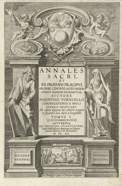 Editor: This is the title page to "Habiti antichi et moderni di tutto il mondo", or "Ancient and Modern Habits of the Whole World," a 1598 print featuring engraving and etching. It seems very elaborate for just a title page! What do you make of its overall design and message? Curator: Indeed! It’s critical to look past the ornate frame and ask ourselves: what narrative is this "world" actually constructing? The four figures, labeled "Africa," "Asia," "America," at the corners, tell a very specific story about power and representation, wouldn't you agree? Editor: It seems like each continent is represented by a... well, a character! Asia and Africa appear female, while ‘America’ isn’t labelled as anything at all... and they look like idealized versions. Curator: Exactly. Who is doing the idealizing? Remember that these images circulated within a European context during a period of intense colonization. These "habits"—clothing, customs—become objects of study and, ultimately, control. It’s about a gaze, a power dynamic being visually constructed and disseminated. What do you make of how the artist utilizes those visual cues? Editor: I see what you mean, now. The artist’s choice of what to represent, and how, becomes an exercise in defining "otherness." It’s pretty uncomfortable, to be honest. I was initially drawn in by the craftsmanship, but now I see how that skill serves a larger, more problematic purpose. Curator: Precisely. We should interrogate these historical representations, especially when they claim to depict "the whole world." That so-called "whole world" leaves out many voices. It urges us to examine who creates narratives, whose voices are amplified, and whose are silenced. Editor: Thanks! It’s really changed the way I understand this image – from a visually appealing object to something that actively shaped perceptions. Curator: Wonderful. Art history at its finest: we challenge inherited knowledge to illuminate marginalized people's experiences.