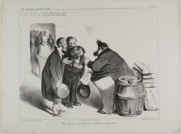Curator: Let’s turn our attention to this lithograph by Honoré Daumier, a master of satire, titled "Honest Reward to the Obedient Electors." Editor: It strikes me as incredibly cynical, almost a grotesque parody of power. Look at the sheer bulk of the figure handing out...something. Curator: Yes, Daumier skillfully uses lithography to critique the corrupt practices of the French government, particularly the buying of votes with promises and favors. Observe the expressions. Editor: They seem almost pitiful, doesn't it? Like dogs begging for scraps. And is that a barrel of coins beside them? It's all so blatantly transactional, it's sad. Curator: Exactly, the composition emphasizes the power dynamic through scale and positioning, highlighting how economic incentives manipulate political processes. Editor: I think Daumier brilliantly captured the dark humor in such a bleak situation. It's a reminder that sometimes, the most honest art comes from staring unflinchingly at what's broken.