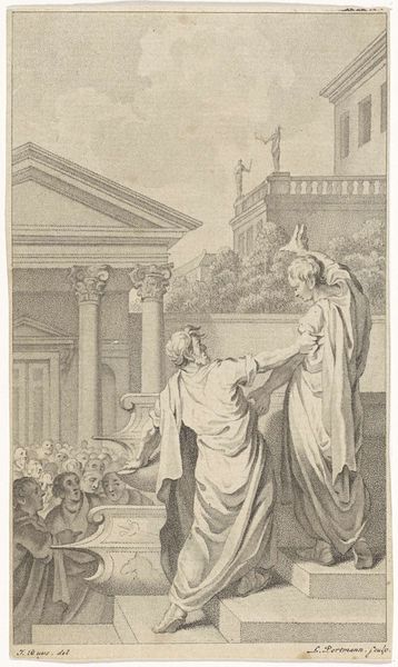 Editor: This is Frederic Leighton’s “Eliezer and Rebekah,” a print from "Dalziels' Bible Gallery," dating between 1865 and 1881. I’m struck by the composition; the figures are so deliberately arranged, almost staged. What do you see in this piece? Curator: I see a Victorian fantasy constructed around biblical narratives, and as such, a powerful assertion of colonial ideals of beauty and power. Notice how Rebekah and the other women are rendered, classical figures framed within an orientalist setting. Leighton wasn't merely illustrating a bible story, but rather imprinting Victorian values of femininity and civilization onto an ancient tale. What power dynamics are at play, and whose gaze is being privileged? Editor: That's a very interesting point. I was focused on the aesthetics and hadn't considered the power dynamics. So you're saying this image, while seemingly religious, is also deeply implicated in colonial ideology? Curator: Precisely. Think about how images like these were disseminated: in bibles, art books, reproduced widely, shaping public perception not only of biblical stories, but of the ‘Orient’ and its inhabitants. The “Dalziels' Bible Gallery” provided an opportunity for artists like Leighton to frame biblical stories through a particular lens. What implications might that have? Editor: It almost feels like Leighton is using the biblical story as a justification for Victorian ideals of beauty and race. The women look so passively graceful; it feels less like a representation of the story and more like a commentary on the Victorian perception of the Middle East. Curator: Exactly. And that brings up key questions: Who is Rebekah in this narrative, and how has that understanding shifted over time, influenced by these visual representations? The image is a conversation piece, and the historical, cultural contexts allow us to challenge the singular interpretation it might initially propose. Editor: I see it so differently now! I’m going to remember that looking at the cultural background behind an artwork is essential. Curator: And remembering how it impacts us, even now. It's never just "art," it's always an intervention.