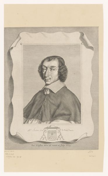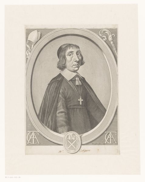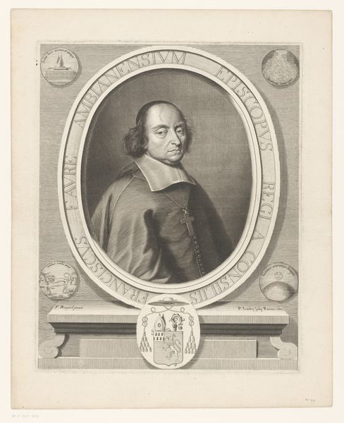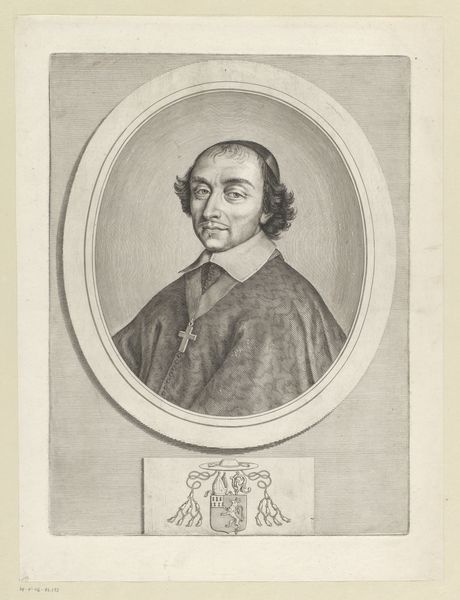 Michel Lasne created this engraving, "Portret van Pierre de Cambout de Coislin," using meticulous lines to capture the essence of its subject. At first glance, the composition, framed by an octagonal border and heraldic emblem, presents a study in contrasts: the softness of the figure against the geometric rigidity. Lasne's masterful use of line is palpable, each stroke contributing to a network of signs denoting status and character. The gaze, though direct, is softened by the linear texture of the face. The composition’s reliance on geometric shapes and heraldic symbols establishes a visual language reflective of the period’s social order, where identity and status were rigidly codified. The octagonal frame, a distinct formal choice, enhances the symbolic depth. It challenges the conventional boundaries of portraiture by embedding Pierre within layers of representation, thereby complicating any singular, fixed meaning. This work thus invites us to consider how representation itself, through form and structure, negotiates identity and power.