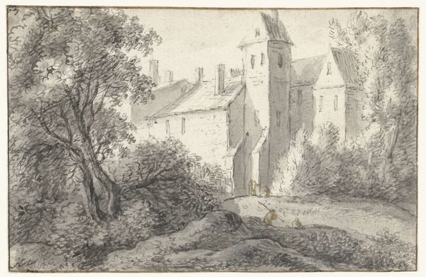 Curator: Welcome! We’re standing before Roelant Savery’s “Slot med skov til venstre. Schwamenburg Slot?” a drawing, likely done sometime between 1600 and 1700. Editor: My first impression is of a kind of quiet drama. The pale wash of the sky seems to weigh down on this imposing structure, while the forest on the left appears windswept, almost ghostly. Curator: Indeed, that stark contrast is interesting. Castles, of course, were not merely defensive structures, but powerful symbols of socio-political hierarchies. Note how Savery situates the castle on high ground—the trees on the left soften the image but cannot truly balance its authority. I wonder, who inhabited such a structure, and how did its imposing presence influence local populations? Editor: Absolutely, but look at how he's used tone. That towering structure mimics, in a way, the dynamism of the forest it contrasts, both rendered in shades of brown. The castle’s tower dominates – literally reaching for the sky. Towers are phallic symbols, a patriarchal claim to the surrounding space. Curator: An interesting read! Perhaps we could expand this into broader interpretations of the role of nobility as patriarchal structures. How the landscape supports these hierarchies needs further attention too. Editor: And note, the foliage softens the edges, creating a sense of timelessness. Castles are relics, memories, both protective and potentially dangerous. This artwork uses potent symbols of strength. The warm tones add another layer, hinting at both solidity and impermanence. Curator: Agreed. Impermanence is certainly present; even structures of power are not exempt from historical change. This piece raises the role of architecture and environment working to uphold—and ultimately challenge—inherited power structures. Editor: Exactly! It becomes a symbol open for us to ponder. A potent image, resonating through time and changing circumstances. Curator: Well, exploring its layered context and symbolism surely brings us closer to its complex place in the narratives of history. Editor: I agree. Thank you for a stimulating analysis, it shed so much light!