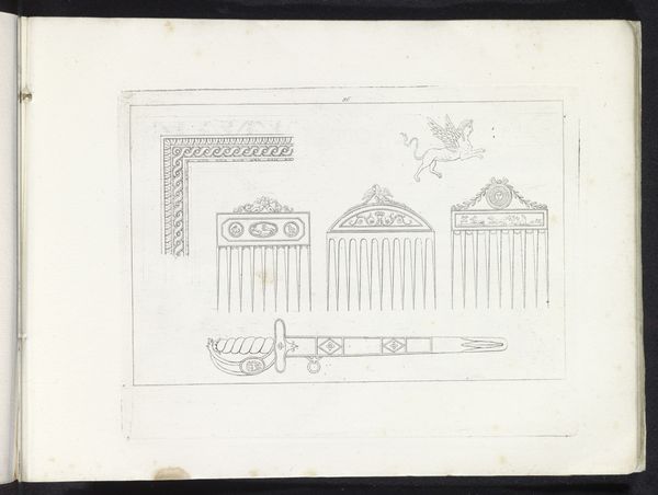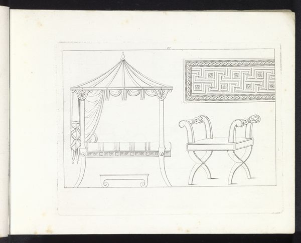 Curator: Looking at this 1817 pen-and-ink drawing, “Ornamentele rand, rozet, bad en oven die badwater verwarmt” by Pietro Ruga, my immediate thought is, wow, this looks chilly. Editor: Exactly! An austerity in design and almost clinically rendered, wouldn't you say? I'm immediately struck by its depiction of domestic infrastructure, practically a 19th-century brochure on hydrotherapy and the mechanization of bathing rituals. Curator: Yes! It's sparse, but hints at aspirations of cleanliness. The way Ruga delineates the rosette motif alongside the bath apparatus; I read an interesting tension between ornament and utility. The details are meticulously rendered – it’s technical, yet so beautiful. Editor: Precisely. See how the materials become almost theatrical in their staging? The sketched drapes surrounding the bathtub almost fetishize what could be seen as purely functional apparatus. This goes far beyond pure function; it’s aspirational display and even indulgent consumption in the neoclassical age. Curator: It feels quite personal. The level of detail implies Ruga was truly engrossed in his subject, maybe even envisioning these objects within his own private world. One could imagine him finding a particular comfort in such ritualized cleanliness, an obsession even. Editor: Agreed, but let's think about who might have benefited from and used such facilities? It is also indicative of shifts in material culture driven by both hygiene reform as well as evolving economic circumstances. Luxury in plain sight, wouldn't you say? Curator: Absolutely. Looking at these carefully etched lines, I find myself pondering the simple joys Ruga may have unearthed while immersed in these designs. Perhaps it's an invitation to find beauty in simplicity—or just a fondness for well-heated bathwater on a chilly day. Editor: It's a powerful testament to the social life of objects and labor of the sketch. By examining how such items were conceived, manufactured, and ultimately circulated in 1817, we discover unexpected histories—material stories embedded right there in ink on paper.