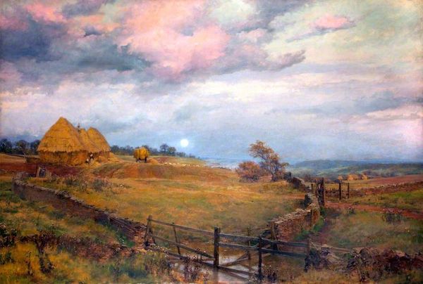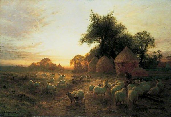 Curator: This is Henry William Banks Davis's 1863 painting, "Twilight, Vallée de la Cluse, near Boulogne". It's just sublime. Editor: A bucolic scene. The composition is soothing. What do you see in those gathering sheep, an emblem, perhaps, of quietude or perhaps something deeper? Curator: Oh, it's totally hitting me in the nostalgia center. Davis painted this landscape with a serene mastery of light. The way he captures the golden hues kissing the sheep as the day melts... it’s just transporting, like a favorite memory surfacing in amber. The light, as its title suggests, speaks volumes. The gathering dusk. A natural end to something. Editor: Yes, and notice how the shepherd and his dog are dwarfed by the scale of the landscape? The artist places humanity within the vastness of nature. They could stand as emblems of guidance and care. Sheep as bleating innocents under watchful guard? Curator: Or perhaps, an exploration of solitude and companionship? I like that even more! The symbolism gets deliciously complicated. Those meandering sheep. They evoke thoughts of journey. Each fleecy figure seems to carry a wisp of the day’s events, almost as though these wooly wanderers carry our very daydreams with them. Editor: Dreams fading into the horizon? Look at the symbolism in the sky. The clouds create the impression of a higher plane, and those streaks... like golden fingers blessing the pastoral narrative below. It's a symbolic parting. The end. Curator: Parting? No, no… more like a tender unveiling. As the sky takes center stage, it unveils all those gorgeous pastel shades – like a dreamy kiss goodnight! He perfectly frames a tranquil transition in nature; I think we tend to mirror that too. Editor: But even that tender unveiling suggests an end of sorts. And isn’t the eternal return inherent in the image, given the title and composition? Curator: True, but consider the possibility it reveals cyclical hope! It makes the artwork more personally resonate. This is an experience, not just an observation. I hope you at least found that, listening. Editor: And so we complete the circle of analysis with subjective impression. A comforting visual poem with the weight of passing time as its resonant chord.