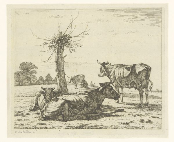 Curator: Here we have Charles-François Daubigny’s etching, "The Donkey in the Meadow," created in 1862. It's currently part of the collection at the Art Institute of Chicago. Editor: The delicacy of the etching strikes me immediately—it’s almost dreamlike, capturing a fleeting moment in the countryside. The composition feels very balanced, even with the strong diagonal lines. Curator: Daubigny was a key figure in the development of French Realism and later, Impressionism. His dedication to "plein-air" or open-air painting positioned him as a radical voice in portraying everyday life in the countryside. This print, along with other genre paintings and landscapes, rejects academic idealism and confronts issues of the rural worker, the environment, and societal hierarchies. Editor: Yes, the materiality is central here, too. As an etching, it allowed Daubigny a freedom of line that was innovative at the time. Observe the artist's focus on tone through hatching and cross-hatching that effectively conveys light and shadow—there's a softness to the foliage achieved through purely graphic means, despite the gritty industrial processes. The relationship between the donkey and the landscape becomes quite evocative. Curator: Exactly! The placement of the donkey isn't incidental. Donkeys historically faced relentless work in agricultural societies, enduring hardship with limited resources and the burdens society placed upon them. The work thus is evocative of socio-economic injustices of that era, when modernization was encroaching traditional agrarian practices. Also, you notice some smaller figures on the other side of the donkey? It gives it this voyeuristic view of a pastoral scene. Editor: True, this artwork captures Daubigny’s fascination with capturing everyday life while pushing the boundaries of printmaking techniques of the time, particularly with its range of tonal variations using only etched lines. It really brings us into the scene, a hazy view into nature's embrace. Curator: It also brings forth pressing socio-political issues relating to class and labor of the time. Considering Daubigny’s personal politics allows this relatively plain-sight scene to have multi-faceted and nuanced socio-historical interpretations. Editor: This close inspection underscores how Daubigny effectively merged both observation and technique to evoke such a distinct response in his viewers. Curator: Hopefully that makes everyone think about how different techniques open our eyes to a painting’s context in different ways.