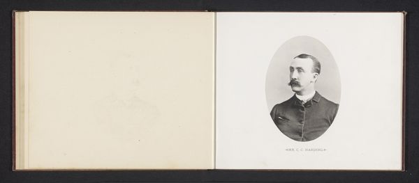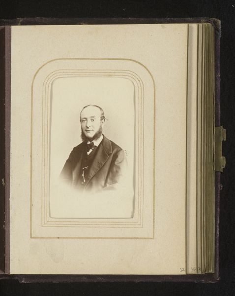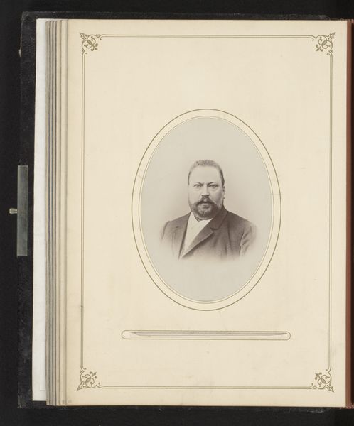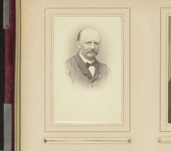 Curator: What a fascinating find! This is "Portret van een man met snor"—Portrait of a Man with a Moustache—dating from between 1860 and 1900. It's an albumen print photograph nestled within an album. Editor: My first impression is the severe contrast in the image. It is a remarkably constrained composition. A gentleman appears somewhat bleached in stark relief against his dark suit, framed within a darkened album page. Curator: Absolutely, and albumen prints, known for their clarity and fine detail, were very popular during that time for portraiture, driven by the rising middle class. Having one’s portrait taken and stored in albums became an accessible symbol of status. Editor: The photographic clarity invites forensic viewing of minute details. But, it almost works too well: every follicle is captured under glass in a display of bourgeois earnestness. I find his symmetrical moustache distracting! Curator: But the moustache, that very feature, it’s the era encapsulated! Such grooming and photographic conventions really cemented a particular self-image as desired by a specific demographic, and propagated by photography studios. Editor: It is fascinating how such clarity offers both precision and abstraction simultaneously; our man recedes behind its trappings: coat, cravat, hirsute adornment! Curator: Photography studios acted almost as engines for crafting public identities. How subjects presented themselves was key to the commerce of such places. Editor: Though stark and posed, his eyes convey some spark, an echo, perhaps of the world beyond representation, hinting at what an attentive eye may have noticed behind rigid formal codes. Curator: The rise of photography dramatically affected portraiture. We go from unique paintings owned mostly by aristocracy, to mass-produced portraits becoming a more democratic means of controlling one's legacy. Editor: One senses in his rigid formality a certain awkwardness; caught as it were within artifice itself, between presence and representation, somewhere we remain as viewers. Curator: Very astute; in viewing photos, we are forced to contend with both what a subject intended and the ways history itself shaped the representation. A lovely image indeed. Editor: Agreed; a photograph captures fleeting expressions and historical postures that make it, if not a window onto history, a compelling mirror nonetheless.