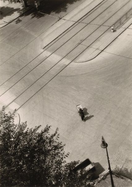 László Moholy-Nagy made this photograph, titled 7 A.M., using a camera and darkroom techniques that, by his time, had become fairly industrialized. The image shows a bird's-eye view of city life, capturing figures in transit and a streetscape punctuated by stark shadows. What makes this more than just a snapshot is its deliberate composition. The high angle flattens the scene, emphasizing the geometry of the urban environment. Notice the way the light rakes across the pavement, highlighting the textures of the road. Moholy-Nagy was deeply interested in the interplay of light and shadow, and his images were often abstract exercises in form. Yet, the photograph also provides a glimpse into the rhythms of everyday life. The lone cyclist and distant figures remind us of the human activity that animates the modern city. Ultimately, the photograph encourages us to reconsider the relationship between art, design, and social observation. It's a reminder that even the most mundane scenes can be elevated to art through careful attention to materials, light, and composition.
