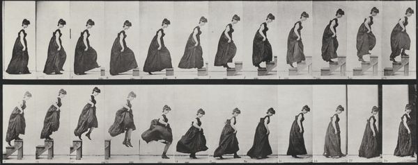 Curator: I see this piece as quite dreamlike; it captures a fleeting moment, almost as if glimpsed through time. Editor: You’ve intuited the magic of this work. What we’re looking at is “Plate Number 45. Two women walking, meeting and partly turning,” a gelatin-silver print made in 1887 by Eadweard Muybridge. He's most famous for his groundbreaking work in capturing motion. Curator: Yes, that temporal sense makes it so striking. It evokes a very particular mood in monochrome. The repetition, almost like frames from a film reel, feels both scientific and strangely romantic. Editor: The work's impact resonates beyond aesthetics, touching upon broader issues. This was made during a time of rigid social constraints, especially for women. I see their figures within these individual frames, and they’re almost being analyzed. How free were these women to actually move outside of a space like this? Curator: That constraint makes it all the more poignant. Their encounter seems brief, their bodies slightly blurred, and there's a vulnerability inherent to the poses, captured at what must have felt like very intrusive, unfamiliar angles. Editor: And while it visually dissects their motion, in another light, this also monumentalizes the most fleeting of gestures shared between two women walking on the street, at a time where their very freedom of movement was being heavily surveilled and scrutinized. Curator: Exactly! It raises essential questions around societal observation, and the relationship between women and representation. So I'd agree with you—it does capture a unique historical moment, fraught with tension. Editor: Indeed. The image persists in my mind not merely as an early instance of motion photography but as a critical document unveiling the power dynamics embedded within visual representation. Curator: This experience certainly prompts me to reevaluate the assumed objectivity inherent in early photographic techniques, and reveals so much more of the narrative of women and motion at that time. Editor: Agreed. The seeming simplicity masks profound questions regarding bodily autonomy and visual surveillance that feel incredibly relevant to modern discourse.
