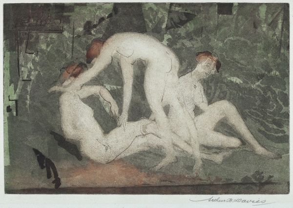 Curator: What strikes me first is this feeling of ancient grace mixed with a kind of... well, almost unsettling ambiguity. Editor: Indeed. You’re looking at Sir Thomas Monnington's "Allegory." Monnington, who lived from 1902 to 1976, offers us here a landscape populated by figures that seem to exist just outside our grasp. The support measures over 1 by 2.5 meters. Curator: Outside our grasp, exactly! The figures almost melt into the landscape, their forms echoed in the gentle hills. It feels like a dream where the subconscious takes center stage. The artist used a rather muted palette, didn't he? Editor: Absolutely. And that muted tone, along with the poses of the figures, hints at a deeper symbolic language, doesn't it? The group near the center, interacting with the tree, evokes so many narratives—from classical myths to Edenic tales. Curator: It’s as if Monnington has peeled back a layer, revealing the raw, archetypal energies that underpin our stories. This makes me think about how the landscape reflects our own inner terrain. Editor: And I'm left contemplating the timelessness of these recurring images and how Monnington gives them new life.