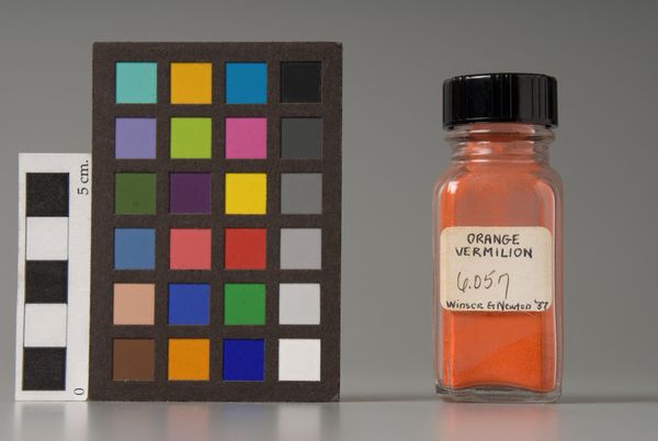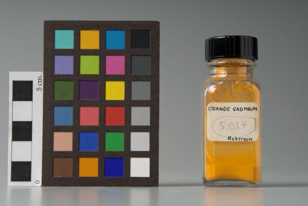 Editor: This is "Cadmium Scarlet," made by F. Weber & Company. It seems to be a jar of pigment, and what strikes me is its raw, almost scientific presentation alongside that colorful card. How does the history of color production inform your understanding of this piece? Curator: It's fascinating to see pigment presented this way, isn't it? Color wasn't always so readily available. What we see here is not just color, but the result of industrial processes that democratized art-making. Editor: Democratized? How so? Curator: Before industrial production, pigments were rare, expensive, and controlled by guilds or wealthy patrons. This jar represents a shift, where vibrant colors became available to a wider range of artists. It changed the social landscape of art. Editor: I never thought about it that way; the politics of color. Thanks for the insight! Curator: My pleasure! It highlights how art materials themselves have a history intertwined with social and economic shifts.