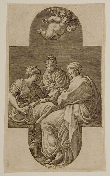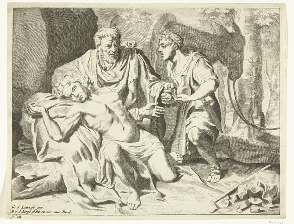Giovanni Cattini created this etching titled 'Four Men in a Study' sometime in the 18th century. Cattini, born in Italy, was known for his engravings and etchings, often depicting historical or genre scenes. In this intimate portrayal of male camaraderie, we find four men in what appears to be a scholar’s study, surrounded by books and immersed in intellectual pursuits. But, it’s the spectrum of emotional states that really captures my attention. One man leans back in his chair seemingly exhausted, another consoles a companion with a gentle hand on his head, and a third watches from behind a bookshelf. The artwork offers us a window into the world of 18th-century masculinity, where intellectual pursuits, and perhaps also anxieties, appear to be part of everyday life. Cattini’s image suggests an awareness of men’s vulnerability, while still upholding traditional class and gender roles. The men’s interactions suggest a shared understanding and empathy amidst their academic endeavors.