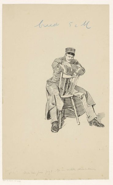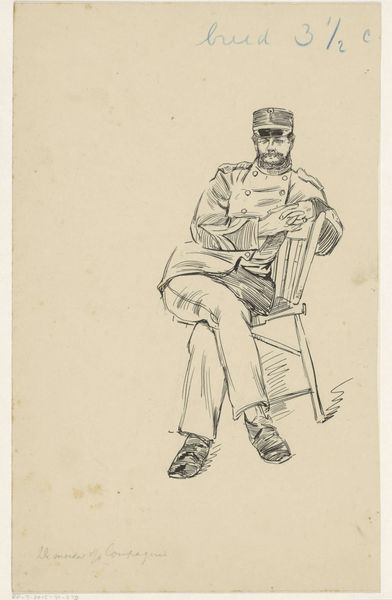 Editor: We’re looking at “Soldier Reading a Letter” by Heinrich Krabbé, made before 1898 using pen and ink. I'm struck by how minimal it is, just lines really, but it still conveys such a strong sense of quiet contemplation. How do you interpret this work through a formal lens? Curator: This work's strength resides in its meticulous mark-making. Note the hatching and cross-hatching, establishing form, volume and texture. It directs the viewer's eye and articulates tonal contrasts within the restricted palette of ink on paper. Editor: So the artist's use of line is doing more than just depicting a scene, it's constructing the emotion, too? Curator: Precisely. Consider the composition: the figure, slightly off-center, balances with the stark geometry of the cot. Observe how the downward diagonal of the soldier's posture is echoed in the lines suggesting the cot’s structure. It draws the eye to the letter—the narrative crux of the piece. It's the linear construction which reveals its formal dynamism. Editor: I see what you mean! It’s interesting how a seemingly simple drawing can be broken down into these separate visual components. Did considering only these things give us the full picture, or are we missing any insights? Curator: Considering just its visual properties provides insights into structure. Analyzing form, however, isn't necessarily an exclusive mode; context and affect could enrich our comprehension. Editor: Thank you. Breaking down this piece to lines and forms and their arrangements is quite illuminating!
