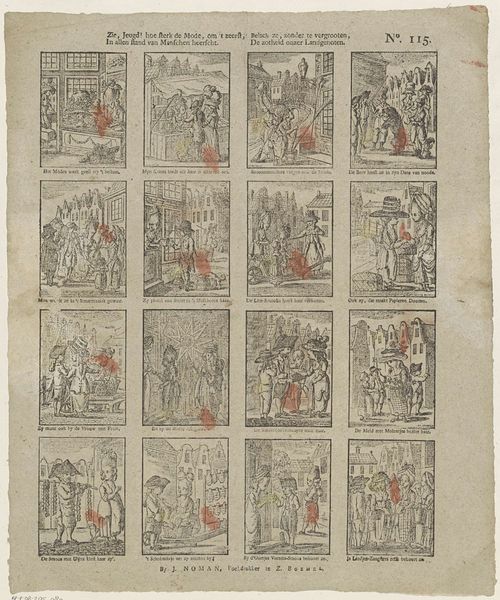 Curator: This engaging woodcut is titled "Bybelsche Figuuren des Ouden Testaments," or "Biblical Figures of the Old Testament," crafted between 1739 and 1786. Jan van Lee, a book and paper seller, printed this work in Haarlem. My initial thought zeroes in on its serial composition. Editor: Immediately, I'm drawn to the visual rhythm. The composition feels like a graphic novel page before graphic novels, right? These segmented stories feel punchy and dramatic, even if they're a bit…stiff. Curator: "Stiff" is a good word. Look closely at the deliberate lines and blocky forms; they speak to the labor-intensive process of woodcut printing. This isn’t about painterly illusion but rather mass production and dissemination of biblical narratives. The materials are paper and wood, readily available resources which meant wider consumption. Editor: True. And yet, the hand-coloring—a touch of orange in key places like crowns and flames—makes me wonder if each sheet received individual attention, blurring the line between craft and mass-produced image. The stories jump out, scenes of what looks like battles, prayer, and general biblical mayhem. Curator: Exactly! The Dutch Golden Age saw the printing press democratize images and biblical themes were frequently appropriated by the masses. Each panel functions as a propaganda tool, designed to teach moral lessons while re-entrenching particular sociopolitical codes and structures of authority. Note that Van Lee himself was a book seller which provides context to why the artist created the woodcut prints. Editor: It's a powerful snapshot into how information—visual and theological—was distributed. It makes you realize how images create society in subtle, manipulative, and yet creative ways. Curator: Indeed. It illustrates the fascinating tension between artistic expression, mass production, and social control that art can perform and exert in this historical moment. Editor: In short, a deceptively simple work holding centuries of rich sociohistorical dialogue and depth. Curator: Absolutely, making us consider that its role transcends the purely religious sphere, opening discussions around economy, culture, and accessibility during the 17th and 18th centuries.