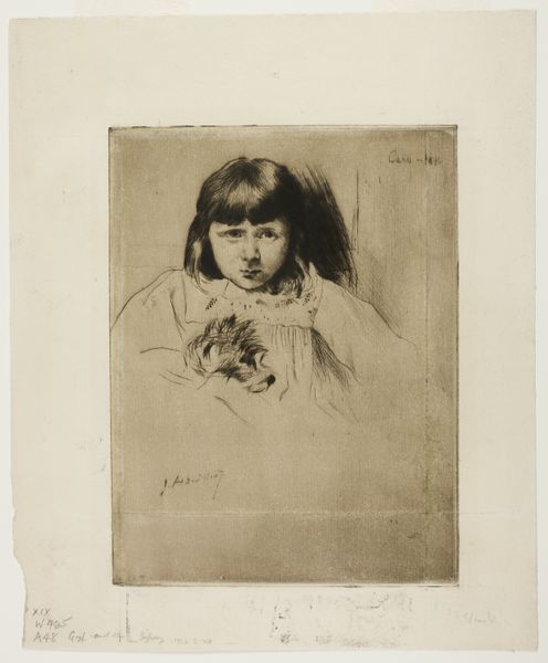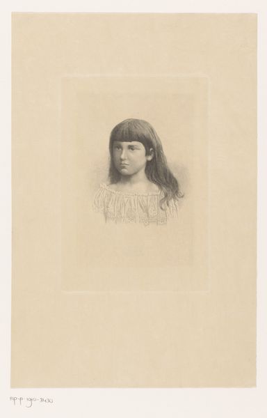 Editor: Right, so next up we have "Portret van een onbekend meisje," or "Portrait of an Unknown Girl," created by Auguste Danse in 1895. It's a drawing and etching on paper. There's a sweetness to this portrait that's quite touching. What strikes you most when you look at it? Curator: That's a beautiful observation. You know, I feel a tender quietude emanating from her gaze, almost a pre-Raphaelite sentimentality captured in those delicate lines. The mystery of her identity also heightens the intrigue. Don't you find it fascinating that an unknown subject can still evoke such a personal connection? Editor: Absolutely. The lack of a known identity allows for broader interpretation, almost like a mirror reflecting our own emotions and memories. Do you think the medium - the etching and drawing - contributes to this intimate feel? Curator: Ah, a splendid question. Definitely! The etching lends a softness, a whispered quality. It feels like a fleeting moment captured, doesn’t it? I’m curious, does the dress seem like a costume, almost theatrical to you? Editor: Now that you mention it, yes! Perhaps suggesting a specific class or even aspiration? Like a visual clue dropped intentionally. Curator: Precisely! The bow seems strategically positioned, creating layers within the portrait. It’s these seemingly minor elements that truly captivate, wouldn’t you agree? Editor: Definitely. It’s made me think differently about portraiture, about the stories hidden beneath the surface. Thanks! Curator: The pleasure was all mine. Remember, art is a conversation, always shifting, always revealing new facets!