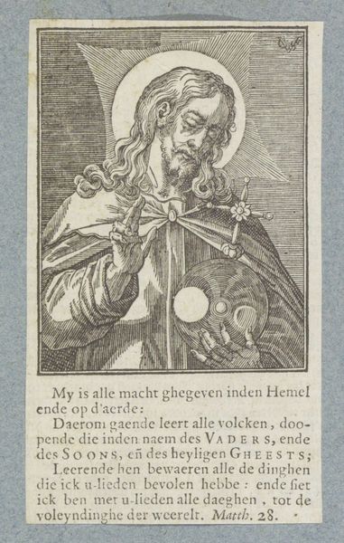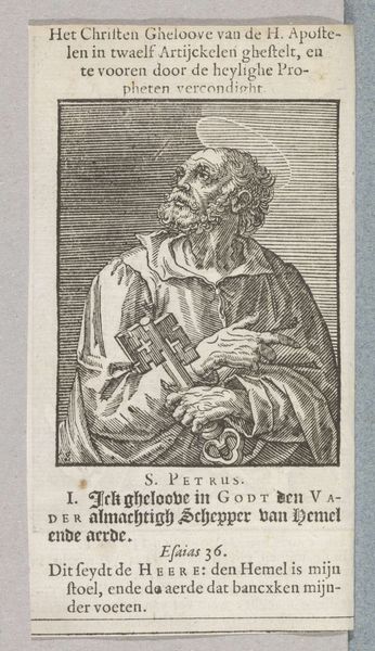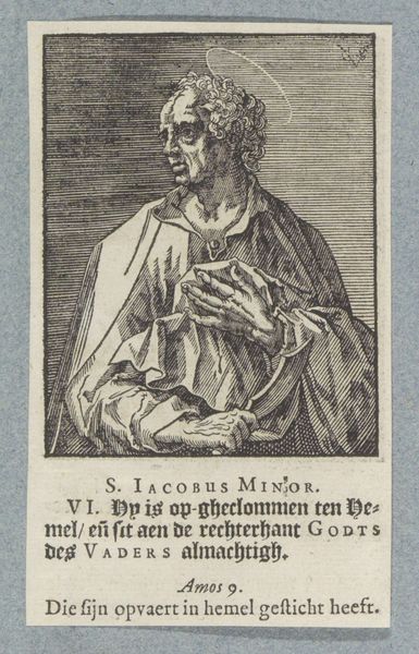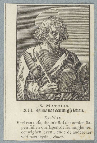 Curator: This is "Apostel Judas Thaddäus," made before 1646 by Christoffel van (II) Sichem, currently residing here at the Rijksmuseum. It's an engraving, a print showcasing a standing figure. My initial impression is its striking starkness – the contrasting lines really draw your eye. Editor: My first thought? Authority, and perhaps, weariness. He looks like a man who has seen a lot, holding a book as a symbol of faith, leaning on a staff for support. The lines forming his face tell a story of hardship, reflecting on the complicated role religion has played in different people's lives across the centuries. Curator: Right. What fascinates me are the lines themselves. Notice the variation in thickness and density—it's all carefully calibrated to suggest form and texture, and its mode of production points towards printmaking as a form of democratized imagery for broad consumption. The physicality of the plate, the ink, and the paper: each step is critical to the final object. Editor: Absolutely. And consider Judas Thaddeus's representation – not as an ethereal being, but a weathered man, close to the earth. What sociopolitical narratives do these engravings allow into circulation during this period, specifically around faith, community, and power? Curator: Precisely. Also the specific ways in which the plate itself degrades or is altered between printings. The small imperfections are telling. They’re not just copies; they’re unique material manifestations. Editor: Thinking about materiality also highlights how these religious figures, replicated and circulated, may become interwoven with other complex issues concerning cultural identities, class structures and so forth in early modern European history. It reveals much about the ways images operated. Curator: Ultimately, a testament to the power of accessible art, reflecting both skilled craftsmanship and cultural dissemination. Editor: An accessible format that leaves room for considering those excluded from religious canon.