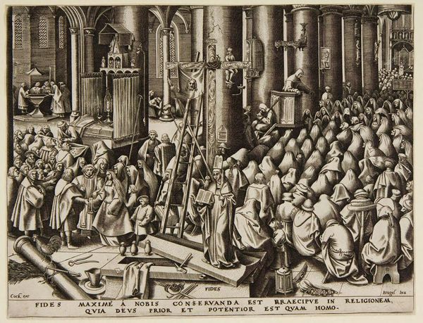 Curator: Look at the stark contrast between the exquisite detail of the foreground and the distant, almost ethereal, city behind. The artist, Jean Fouquet, uses tempera on panel to achieve this captivating scene, dating back to around 1445. It's titled, "The Martyrdom of St. James the Great." Editor: My first impression is the overwhelming stillness despite the obvious brutality. It's strangely beautiful, if such a thing is possible when depicting a beheading! Curator: Yes, Fouquet masterfully orchestrates the composition. He manages to represent power, faith, and suffering all at once. The material reality of the scene is paramount. Notice how he captures the textures of the fabrics, the sheen of the armor, and the pallor of the saint's face. Editor: It makes me wonder about the creation of this work. What was the economic system like? Who commissioned it, and what sort of labor went into its creation? I imagine a small workshop, apprentices grinding pigments... Curator: Precisely. Commissioned works like this were deeply intertwined with the patronage system. We're talking about the intersection of artistry, craftsmanship, and societal power structures. The material value itself was part of the overall experience. Editor: It's quite amazing to consider the human effort to achieve that certain glow of gold highlights. In many ways the opulence is jarring, as I think about this execution set in an otherwise quiet town... Curator: Indeed. Let's not overlook Fouquet’s superb skills. Through a careful study of his painting, you will observe his ability to translate reality onto this wooden panel—a reality of faith, death, and power—forever framed. Editor: Well, thinking about all that Jean Fouquet’s work touches on, and I think it gives a good glimpse into the intersection of wealth and beliefs in Renaissance Europe. Curator: Agreed, this panel offers such a nuanced portrayal that invites endless re-examination, rewarding us with new insights each time.
