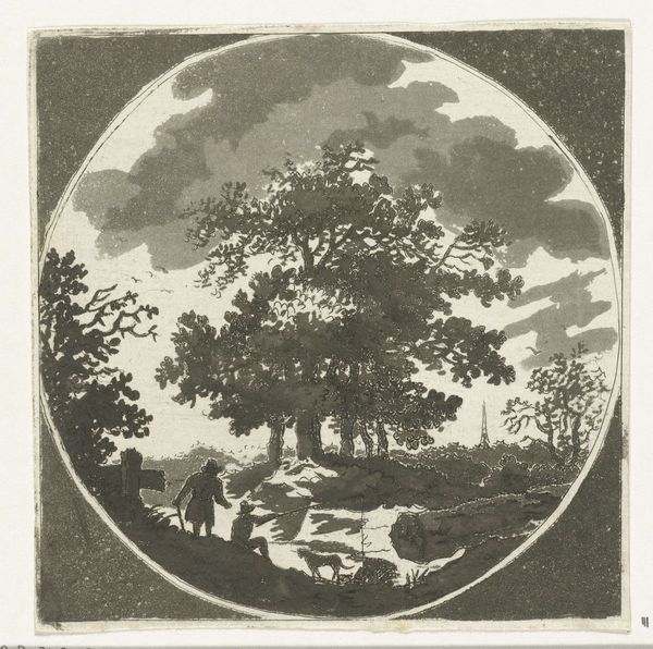 Anthonie van den Bos created this small, circular landscape with pen in brown ink sometime before 1838. The drawing's composition, dominated by a cluster of trees at its center, invites a close look at the relationship between nature and the human figure. The artist employs a limited palette, focusing on tonal variations to create depth and texture. The circular format, a self-contained world, frames a scene where figures are almost absorbed into the landscape, suggesting a meditation on humanity's place within the natural order. The use of line, particularly in the trees and foliage, functions almost as a semiotic code. The lines are not merely descriptive; they actively construct a vision of nature that is both ordered and untamed. In this drawing, van den Bos uses form to convey a complex understanding of space and perspective. It challenges the viewer to see the landscape not just as a backdrop but as a structural element shaping human experience.