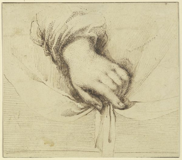 Gerard ter Borch the Younger made this study of a left hand with pen in brown ink, likely in the Netherlands during the mid-17th century. It’s a fascinating demonstration of the draughtsman’s skill, but beyond this, what could a drawing like this tell us about the world in which it was made? Artists in the Dutch Golden Age were increasingly free from aristocratic or religious patronage, and were more reliant on the open market for their livelihoods. The art market in the Netherlands at this time was booming and there was a growth in the market for drawings. Sheets like this were produced as studies for larger paintings, or as independent works of art in their own right. The artist has skillfully rendered the hand and the folds of drapery using a complex system of hatching and cross-hatching. To better understand this drawing, we might investigate how the institutional structures of the art market shaped ter Borch’s artistic production. Scholarly catalogues and archival records of sales can offer valuable insight into the artistic networks and economic conditions that made this study possible. Ultimately, it is this historical context that provides a richer understanding of the drawing’s significance as an object of artistic and economic exchange.