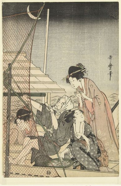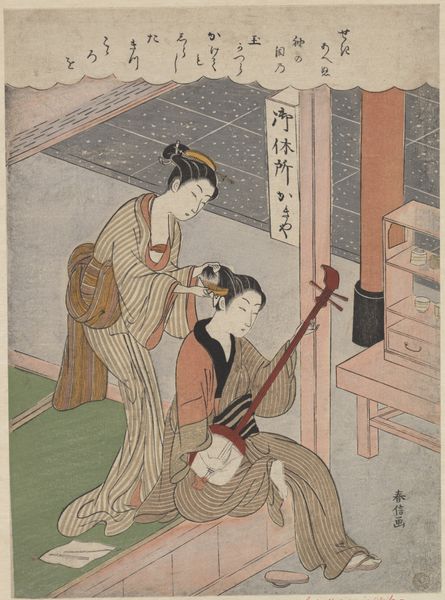 Curator: Here we have Suzuki Harunobu’s woodblock print, “Descending Geese of the Koto Bridges (Kotoji no rakugan), from the series "Eight Views of the Parlor (Zashiki hakkei),” created around 1766. The Art Institute of Chicago is lucky to have it in its collection. It's a truly exquisite piece. Editor: It's remarkably serene. There's such an overwhelming sense of peace just emanating from this scene, with these two women seemingly absorbed in their separate pursuits. Curator: Yes! The composition is wonderful; so subtle yet suggestive. One woman appears to be mending or preparing threads, the other is reading a book, all beneath what looks like a blossoming tree visible through the shoji screen. What about the goose reference from the title? It might seem oddly out of place. Editor: Not really. Geese were often seen as symbols of autumn, of transition, and of messages delivered from afar. But that long instrument tells the true story. The koto—it’s all about refinement and cultural literacy. Curator: And it rests rather symbolically across their laps. Do you find that curious? Editor: Well, it certainly emphasizes the artistry connecting both their occupations—music, literature, textile art… they all weave together here. The lattice-work of the shoji screen in the background reinforces that feeling of intricate connection. Curator: I am totally into that. The subdued color palette, dominated by browns, grays, and soft pinks, enhances that feeling of gentle harmony, wouldn’t you agree? I feel a strong element of romantic melancholy. The transient beauty of nature is there to touch it. Editor: Melancholy fits perfectly. These "Eight Views" were obviously alluding to specific places, but transformed into idealized images of life inside the home and heart. I love the attention to small gestures—the curve of a neck, the slight tilt of a head… these details tell the tale. It could be an everyday image or something intensely private, capturing some of womanhood’s most fleeting instants. Curator: A fleeting moment crystallized… I feel lucky to have had even this short of amount time with Harunobu’s view of interior, harmonious world. Editor: Precisely! It invites reflection on life’s transient beauties and how cultural memory continues in artistic forms—so, time to plan a koto concert!
