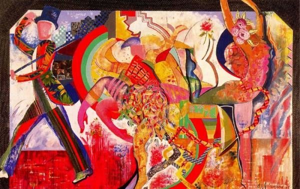 Editor: So, this is "Moving Away," painted in 1985 by Miriam Schapiro. It's an acrylic on canvas, and right off the bat, I’m struck by how busy it is! There's so much pattern and texture competing for attention. What do you see in this piece, given that intense material presence? Curator: It's that 'busy-ness' that grabs me too. Schapiro’s work is all about collapsing the hierarchy between fine art and traditionally "feminine" crafts like quilting and needlework. Look closely – you'll see she incorporates fabric scraps, lace, and other traditionally domestic materials directly onto the canvas alongside the acrylic paint. What does that choice of material suggest to you, in contrast to, say, oil paint? Editor: It makes me think about the labor involved. Oil painting feels elevated, while the fabrics… it makes me think of someone spending hours sewing or mending. A completely different type of making, one often invisible or undervalued. Curator: Exactly! Schapiro was a key figure in the Pattern and Decoration movement. These artists sought to elevate those undervalued crafts and the labor inherent within them. Consider also the title, “Moving Away”. The composition is so fractured, could this be a statement about shifting social landscapes? What materials and methods were deemed appropriate for artmaking, and by whom? Editor: That makes a lot of sense. The patterns do feel almost chaotic, as if these domestic crafts are bursting out of their traditional roles. So, it’s less about the subject matter itself, and more about how Schapiro elevates the *materials* and the process? Curator: Precisely. She reclaims and celebrates materials and making practices often dismissed as merely decorative, thus inherently challenging dominant, patriarchal notions of "high" art. Do you find that alters how you understand the artwork? Editor: Definitely. Before, the busyness felt a bit overwhelming, but now I see it as a deliberate act of defiance and celebration, highlighting undervalued labor. Curator: Indeed, a powerful reminder that artistic value is intrinsically linked to the social context of production and the materials chosen. Editor: I’ll never look at a "decorative" pattern the same way again. Thanks!